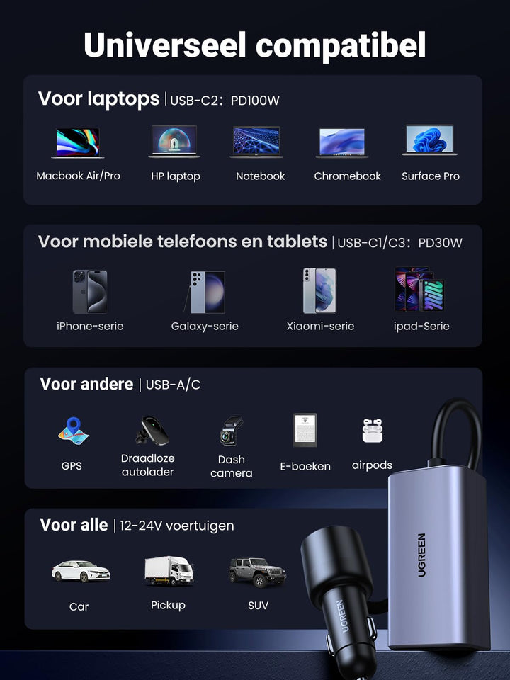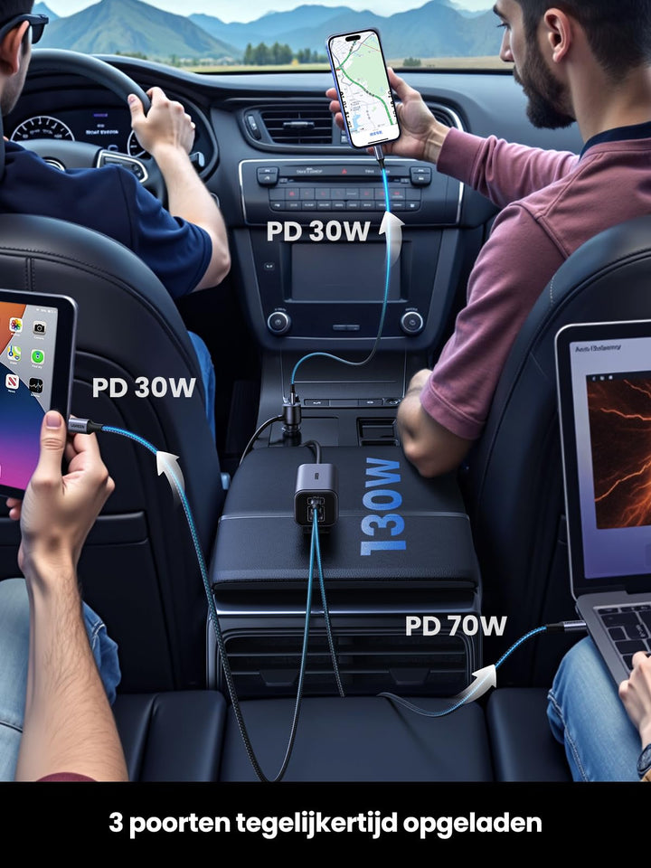 - 4-in-1 laptop-autolader: sigarettenaanstekersplitter van 130 W met 3x USB C-poorten en 1x USB A-poort Dit product kan 4 apparaten tegelijkertijd opladen in een 12V/24V-auto. Het laadvermogen van 4 poorten tegelijkertijd kan 124 W bereiken, en het laadvermogen van 3 poorten tegelijkertijd kan 130 W bereiken. Het kan aan uw dagelijkse apparaatbehoeften voldoen.