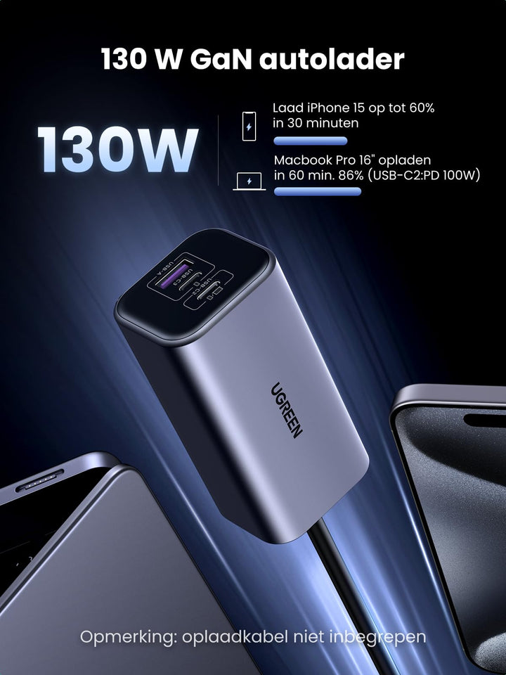UGREEN 130W GaN sigarettenaansteker USB PD3.0 autolader USB C 4-poorts