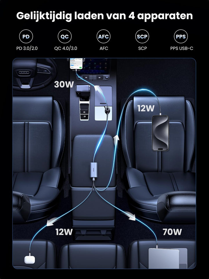 - Eén voor alles, 100 W snel opladen: UGREEN sigarettenaansteker USB 130 W ondersteunt Power Delivery 3.0, Quick Charge 4.0+/3.0, SCP, AFC, 5V/2.4A, Galaxy Super Fast Charging, PPS voor snel opladen. Via de C2-poort van de USB C-autolader wordt MacBook Pro 16" in slechts 60 minuten opgeladen van 0-86%, via de C1/C3-poort kan iPhone 15 in 30 minuten worden opgeladen van 0 naar 60%. Met 3x USB C-poorten en 1x USB A. Snel en zorgeloos kunt u 4 apparaten tegelijkertijd in de auto opladen.